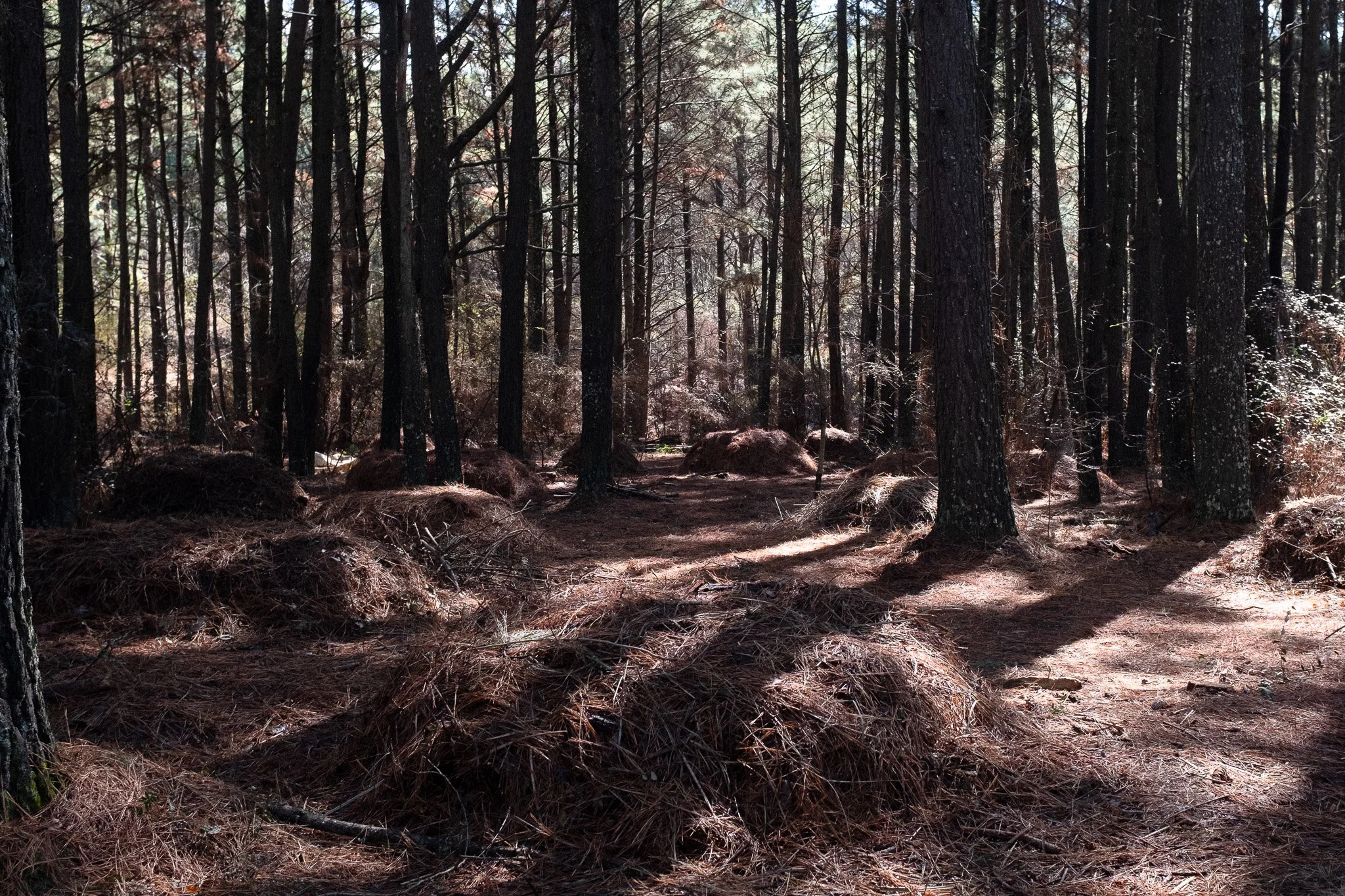La combinación de aguja de pino, ramas y madera en descomposición genera un suelo con alta presencia fúngica y buena estructura.